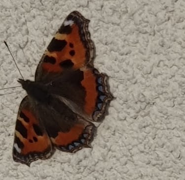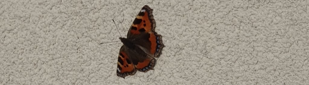 Walking down the hall, I hear an unusual sound. There, flapping behind the Venetian blind in my bedroom, is a Red Admiral butterfly. I can’t remember ever having seen a butterfly at this time of year.